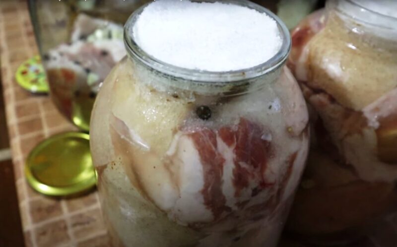 Leiskite sūrymui atvėsti vėsioje vietoje. Supilkite likusią druską į stiklainį ir pripildykite jį ⅓ kiaulienos taukų.