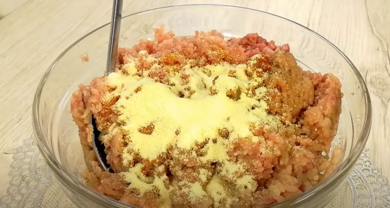 Maltą mėsą pagardinkite druskos, prieskonių ir pipirų mišiniu, suberkite manų kruopas ir česnaką ir išmaišykite iki vientisos masės. Manų kruopos reikalingos tam, kad kepant iš atidaryto paplotėlio neišbėgtų maltos mėsos sultys.