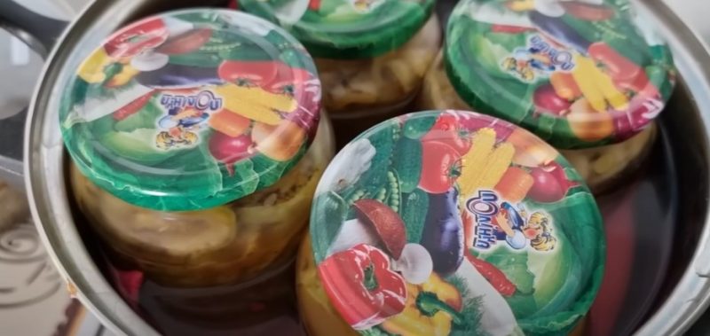 Uždenkite stiklainius dangteliais ir sudėkite juos į puodą ant rankšluosčio. Užpilkite šiltu vandeniu iki pečių ir sterilizuokite 20 minučių nuo užvirimo momento.