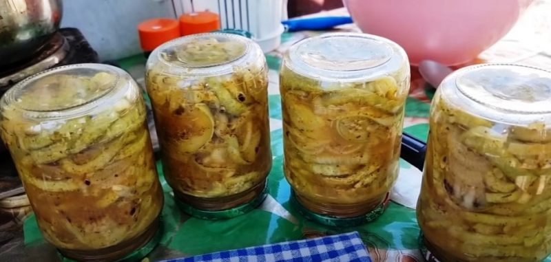 Salotas sudedame į švarius stiklainius ir užpilame išsiskyrusiomis sultimis.