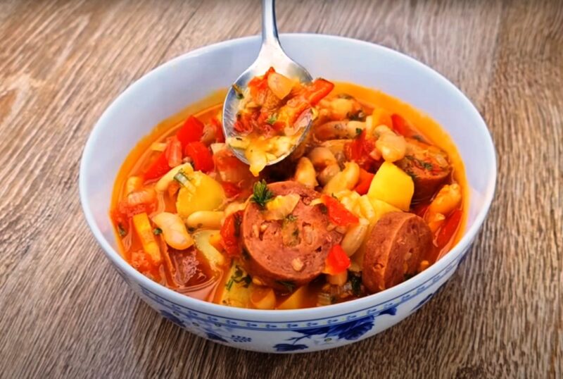 Kol daržovės verda, supjaustykite pomidorą mažais kubeliais. Sudėkite pomidorą ir dešrą į daržoves, tada užpilkite vandeniu. Užvirinkite sriubą, tada sudėkite pupeles.
