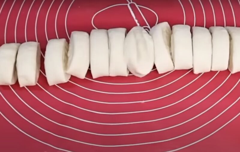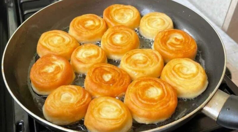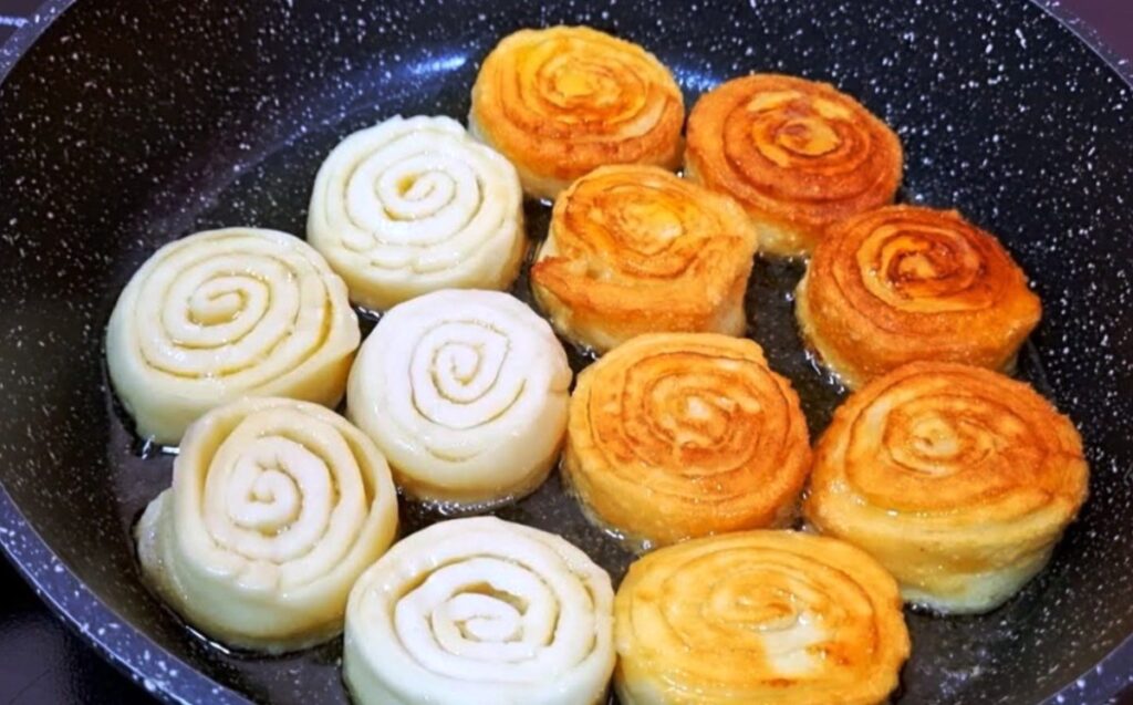 Kol keptuvėje įkaista bent 200 ml augalinio aliejaus, tešlą reikia susukti į ritinį ir pritvirtinti laisvą kraštą.