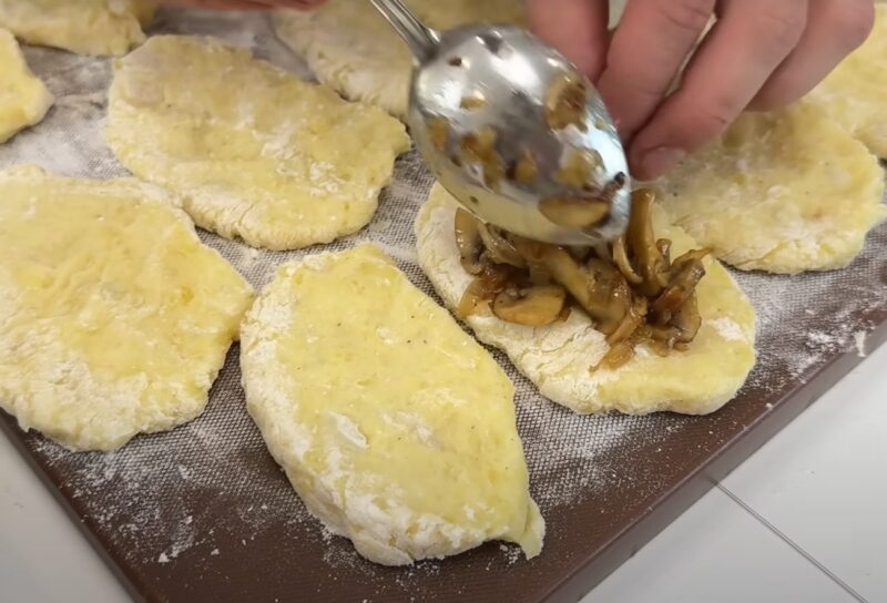 Ant kiekvieno paplotėlio uždėkite po šaukštą įdaro ir užspauskite jį tešlos viduje.
