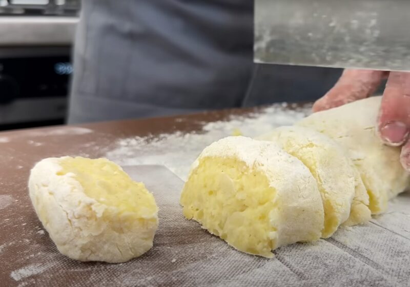 Virtas bulves sutrinkite iki vientisos masės, tada įberkite miltų, druskos ir juodųjų pipirų pagal skonį. Įmuškite kiaušinį į mišinį ir sumaišykite visus ingredientus, kol susidarys lygi, elastinga tešla.