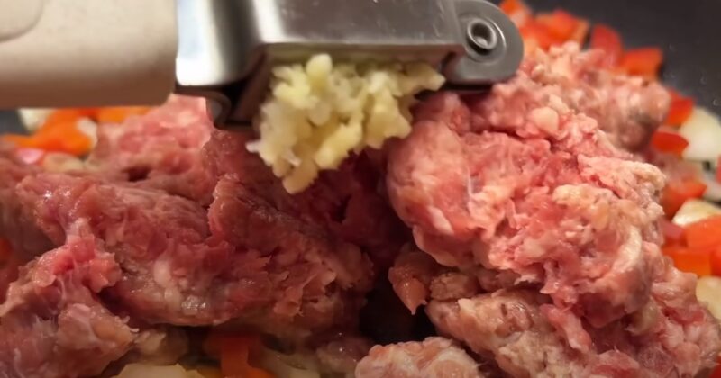 Sudėkite maltą mėsą prie svogūno ir paprikos kartu su išspaustomis česnako skiltelėmis. Kol malta mėsa kepa, nulupkite pomidorą ir smulkiai supjaustykite.