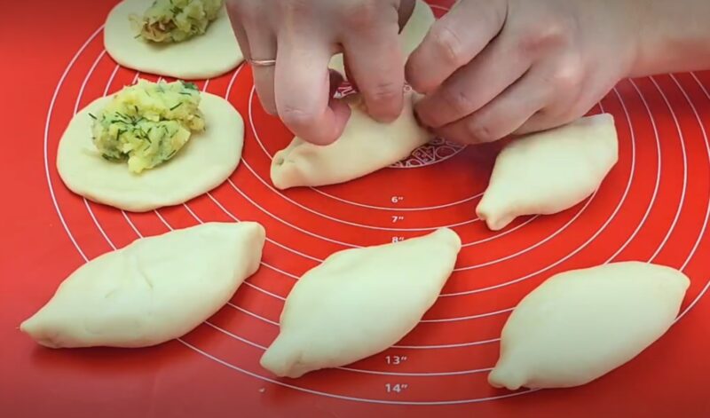Į paplotėlius įdėkite po šaukštą įdaro, užsandarinkite tyrę tešloje ir šiek tiek suplokštinkite paplotėlius.