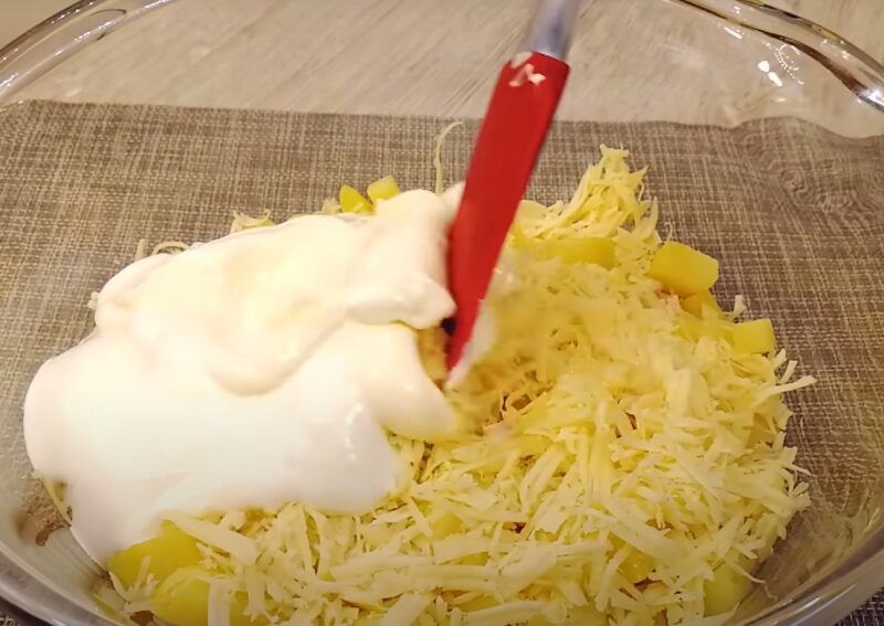 Sūrį stambiai sutarkuokite, sudėkite į dubenį su vištiena, bulvėmis ir ananasais, pagardinkite majonezu ir grietine. Česnako skilteles per presą įspauskite į įdarą, pagardinkite druska ir gerai išmaišykite.