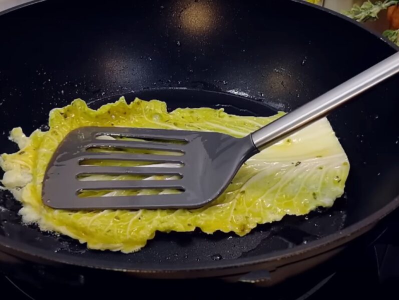 Keptuvėje su augaliniu aliejumi apkepkite kopūstų lapus iš abiejų pusių.