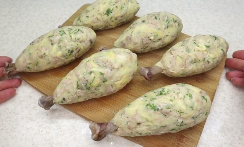 Dubenyje sumaišykite tyrę, mėsą, sūrį ir žoleles, įberkite druskos ir maišykite iki vientisos masės. Suformuokite didelius rutuliukus, į juos įsmeigdami kaulus. Gautas mišinys turėtų priminti vištienos blauzdeles.
