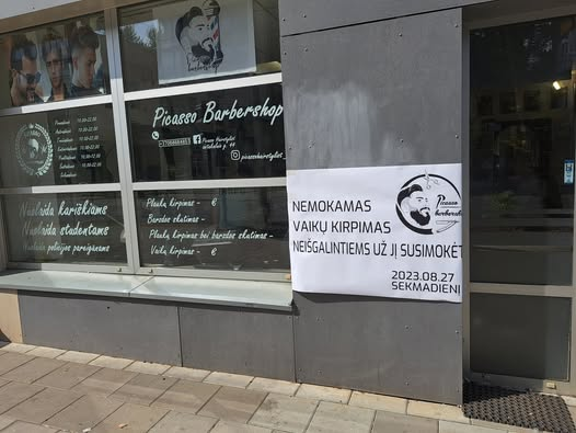 Užrašas, pakabintas ant Antakalnio gatvėje įsikūrusio vyrų grožio salono vitrinos, sujaudino socialinio tinklo „Facebook“ vartotojus. Iškaboje teigiama, kad paskutinį vasaros savaitgalį tėvai, negalintys sumokėti už kirpimą, gali atvesti savo vaikučius ir tai kirpyklos darbuotojai padarys nemokamai. Šį gražų poelgį kirpėjas pakartos ir rugsėjo 3 dieną.