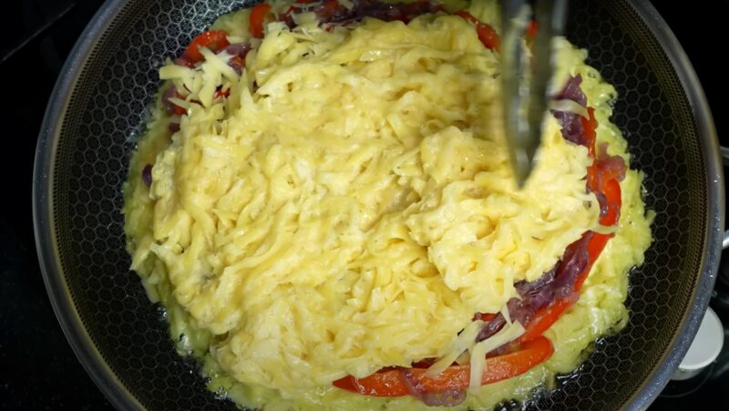 Į bulvių mišinį įberkite krakmolo ir sumaišykite ingredientus. Pusę bulvių mišinio sudėkite į karštą keptuvę. Bulvių sluoksnį pabarstykite sūriu, tada ant sūrio užpilo sudėkite keptas daržoves.