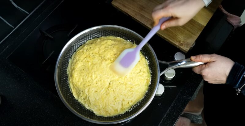 Sūrį labai smulkiai sutarkuokite ir nuspauskite likusį skystį nuo bulvių. Kitame dubenyje išplakite kiaušinius ir druską ir užpilkite ant bulvių mišinio.