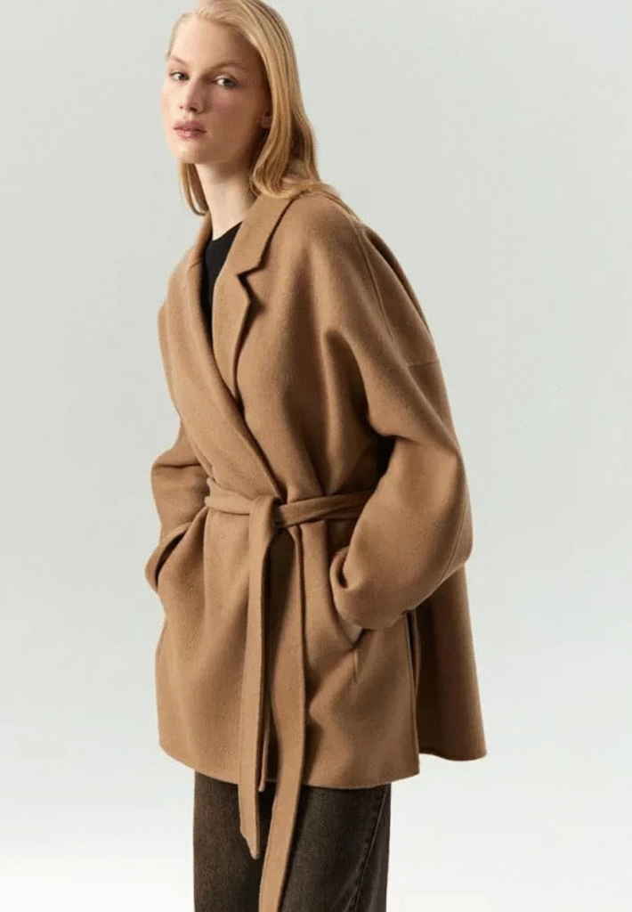 Sezono spalvos – nuo klasikinės karamelės iki pilkai mėlynų atspalvių ir mėtų. Chalatas suteikia vidutinę šilumą, todėl apgalvokite daugiasluoksnį aprangos variantą arba rinkitės jį ne pačioms šalčiausioms dienoms. Pagrindinė taisyklė: neperkraukite aksesuarais – minimalistinės auskarai ir paprasta rankinė idealiai užbaigs įvaizdį.