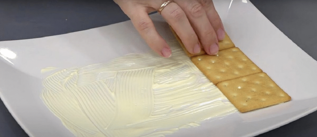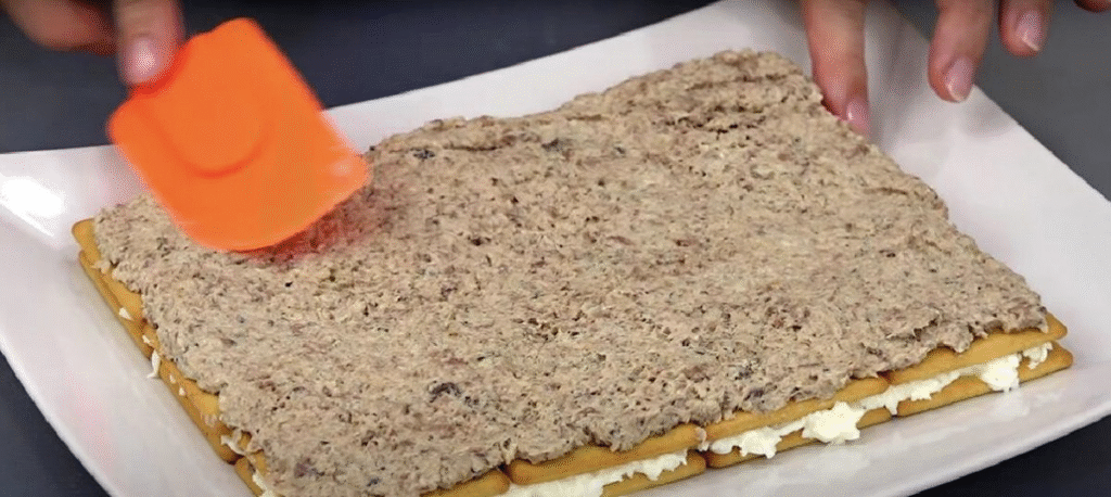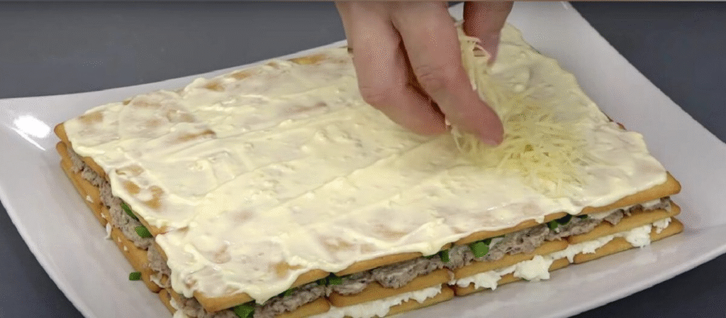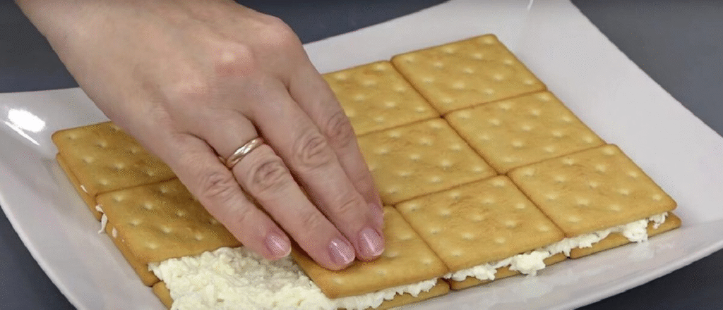 Lėkštės dugną užtepu majonezo sluoksniu ir ant jo uždedu krekerių. Naudoju bet kokius nesaldintus įvairių formų krekerius. Pastaruoju metu krekerius keičiu sluoksniuotos tešlos sluoksniais; tai irgi skanu, nors paruošti užtrunka ilgiau.