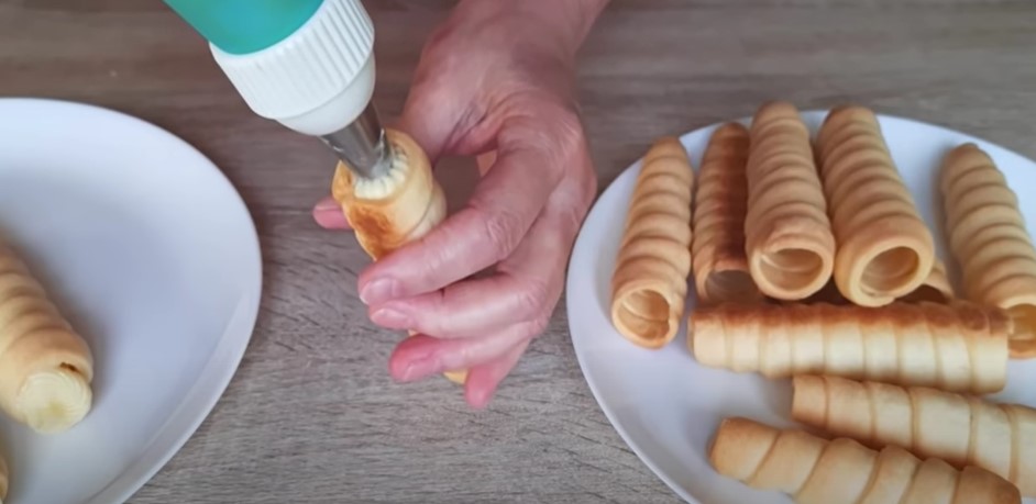Įdėkite grietinėlę į konditerinį maišelį ir išspauskite į kiekvieną tūbelę.