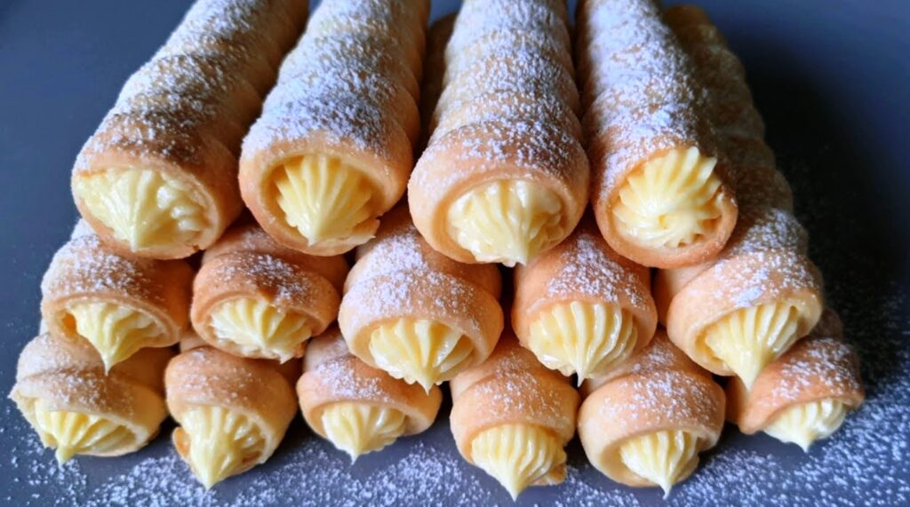 Grietinėle įdaryti vamzdeliai yra gardūs ir paprasti. Šie trapūs sausainiai su klasikiniu kremu yra vienas mėgstamiausių mūsų šeimos desertų, tinkančių tiek kasdienai, tiek ypatingoms progoms.