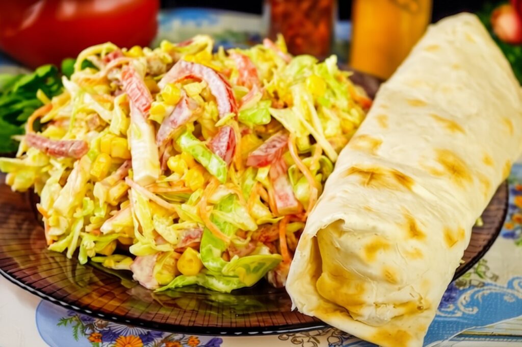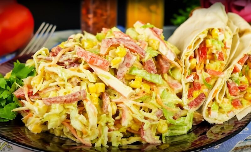 Salotas taip pat galite suvynioti į pita duoną su kreminiu sūriu. Tai bus gardus užkandis ir paprastos, prieinamos salotos.