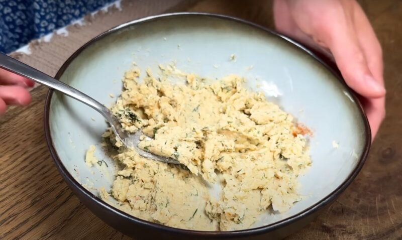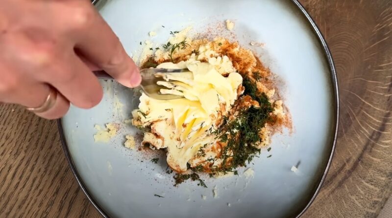 Lydytą sūrį dubenyje sutrinkite šakute ir sudėkite sviestą. Smulkiai supjaustykite krapus, įmaišykite juos į sviesto ir sūrio mišinį kartu su rūkyta paprika ir gerai išmaišykite.