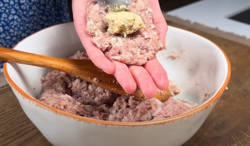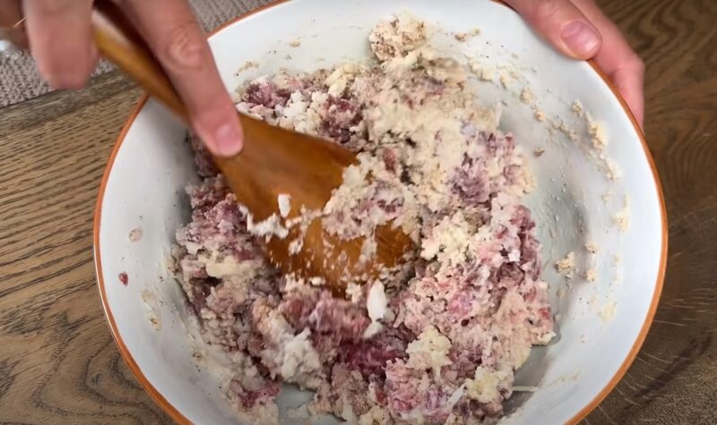 Susmulkinkite ir smulkiai supjaustykite česnako skilteles. Visus ingredientus įmaišykite į maltą mėsą iki vientisos masės.