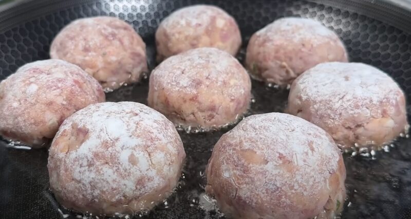Iš maltos mėsos formuojame mažus rutuliukus, kuriuos paverčiame storais paplotėliais.