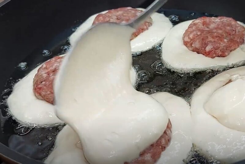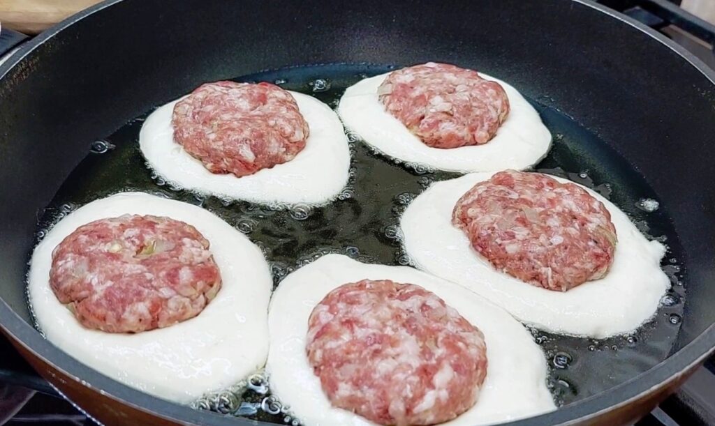 Ant kiekvieno iš šių paplotėlių uždėkite po kotletą ir uždenkite likusia tešla.