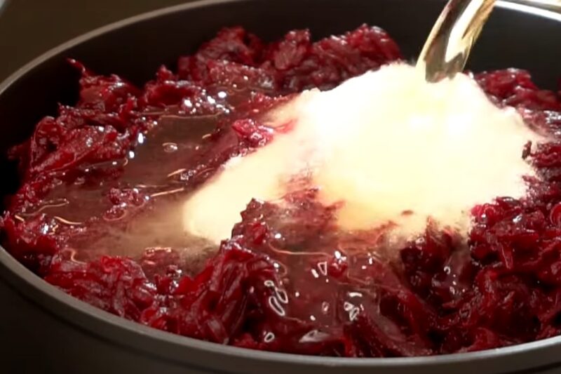 Į burokėlius supilkite citrinos rūgštį ir augalinį aliejų ir užvirinkite ant vidutinės ugnies.