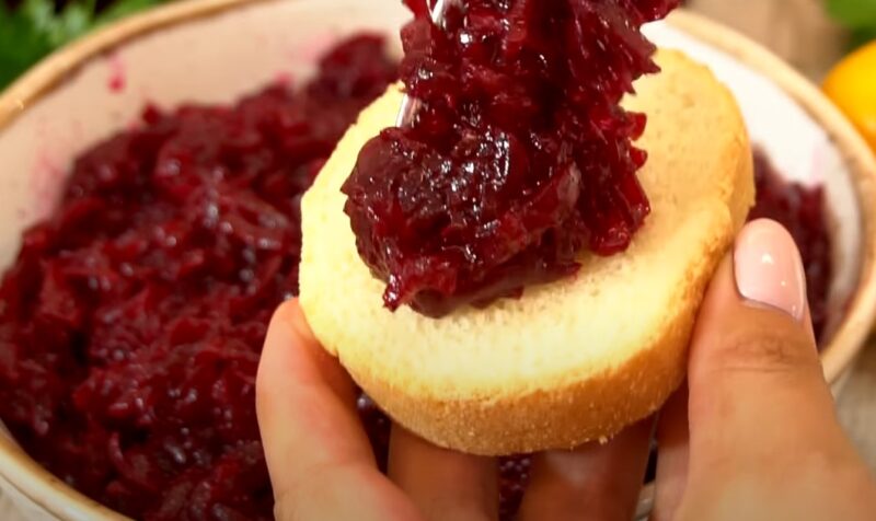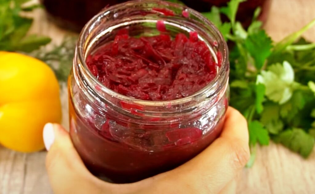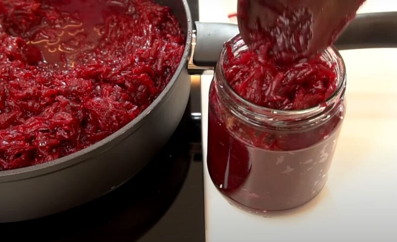 Sterilizuojame dangtelius ir stiklainius, įdedame burokėlių masę į vidų ir visiškai užpildome indus.