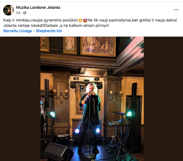 Jolanta ne tik kuria ir įrašinėja dainas, bet ir aktyviai koncertuoja. Neseniai ji pasirodė Londone įsikūrusiame bare „Bernelių užeiga“, kur pasidalijo savo įspūdžiais su gerbėjais. „Kaip ir minėjau, naujas gyvenimo etapas! Ne tik nauji pasirodymai, bet ir nauja daina! Jolanta neilsisi, darbais einu pirmyn, o ne kalbom!“ – rašė ji, dalindamasi nuotrauka iš koncerto.