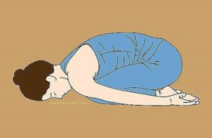 Atsiklaupkite ant žemės pečių plotyje, rankas uždėdami už kūno. Lėtai pasilenkite į priekį, visiškai nuleisdami galvą. Išlikite šioje atsipalaidavusioje pozoje 3–4 minutes, darydami pertraukas tarp gilių, tolygių įkvėpimų ir iškvėpimų, ir pajuskite, kaip atsipalaiduoja jūsų nugara.