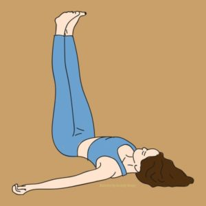 Pakelkite tiesias kojas ir atsiremkite į sieną. Atpalaiduokite liemenį ir rankas. Išbūkite šioje pozoje 3 minutes, giliai kvėpuodami. Stenkitės nuvyti visas nereikalingas mintis ir pajuskite, kaip atsipalaiduoja įsitempusi nugara ir kojos.