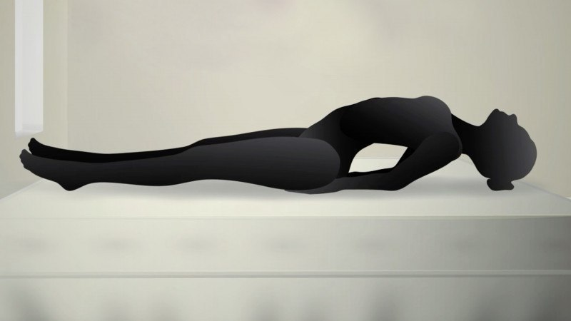 Atsigulkite ant nugaros ir pakelkite kelius. Išskėskite kelius kiek įmanoma plačiau ir suglauskite pėdas. Atpalaiduokite kojas ir leiskite joms kabėti žemyn pagal savo svorį. Atpalaiduokite rankas prie šonų.