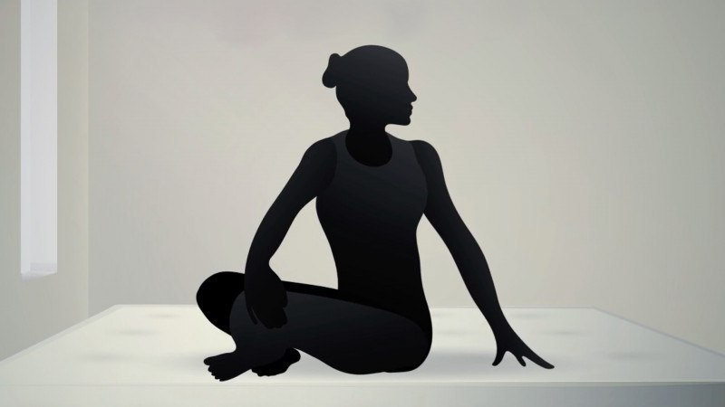 Atsisėskite tiesiai, sukryžiuokite kojas ir uždėkite dešinę ranką ant kairiojo kelio. Kitą ranką uždėkite ant čiužinio už savęs ir švelniai pasukite liemenį į kairę, laikydami dubenį ant čiužinio. Giliai ir tolygiai kvėpuokite. Pakartokite kitoje pusėje.