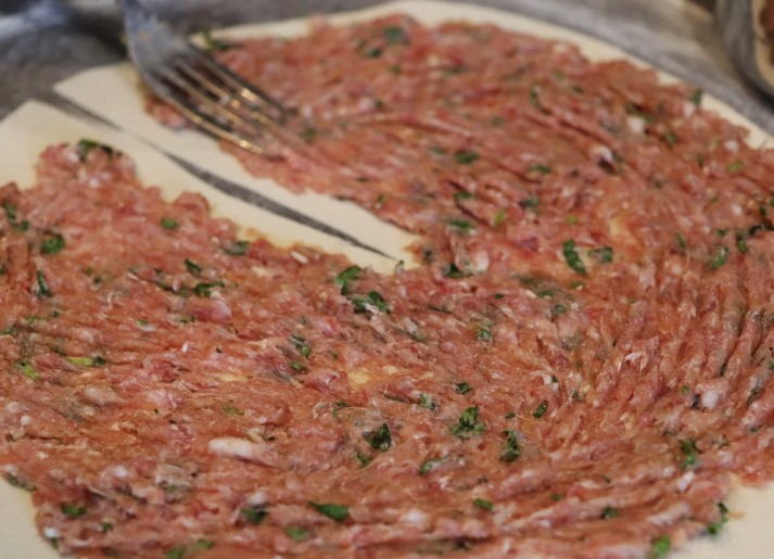 Kai išdėstysite maltą mėsą, likusią tešlą, kurią padengsite įdaru, galite sutepti ištirpintu sviestu, kad bandymo sluoksniai būtų minkšti.
