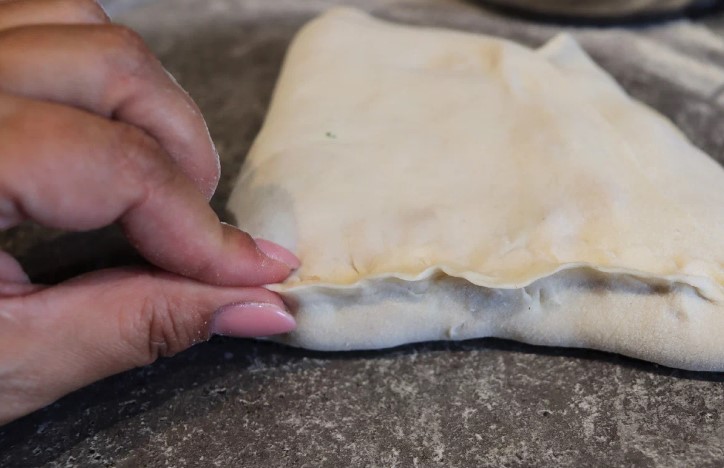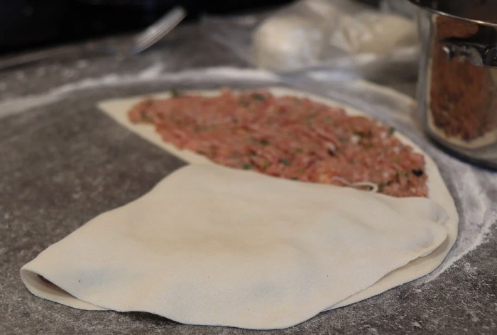 Stalas apibarstomas miltais, paimkite šiek tiek tešlos ir iškočiokite ploną tortiliją. Mes išdėstome smulkintą mėsą ant ketvirtadalio berūdžio sluoksnio ir sulankstome tešlą taip, kad pasirodys trikampis.