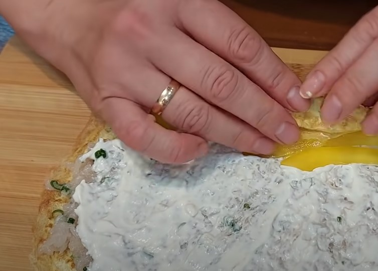 Kiekvienam blynui mes išdėstome mėsos masę, ant viršaus ji yra sutepta grietine ir majonezo padažu. Mes įdėjome šiek tiek šiaudų saldžiųjų pipirų ir pasukame blynus.