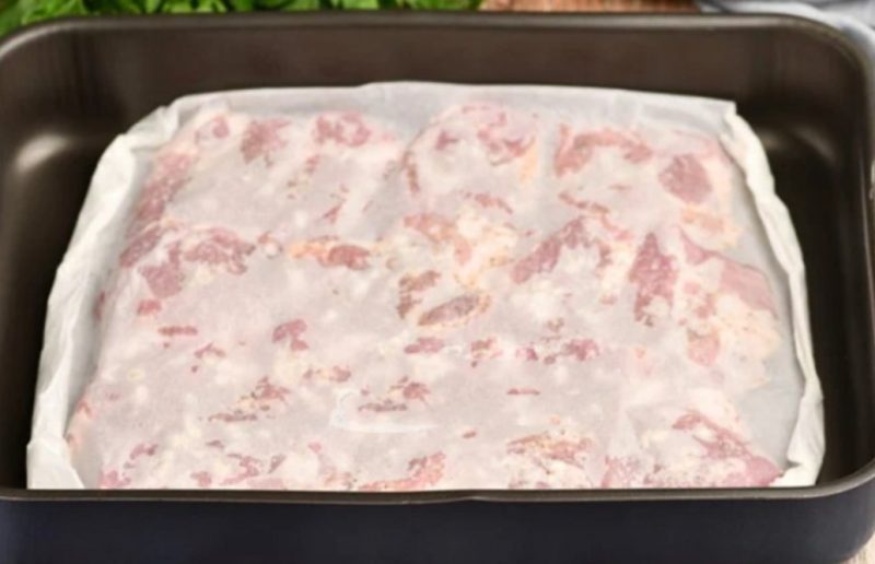 Uždenkite pergamentu, mes gerai užpildome kraštus. Taigi, mėsa yra geriau kepta, ji nėra virti, kaip folijos atveju.