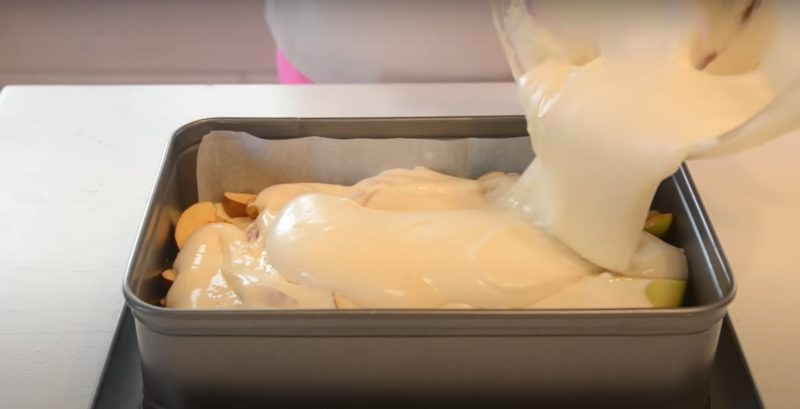 Mes pilame tešlą ant obuolių, bandydami juos užpildyti tolygiai.