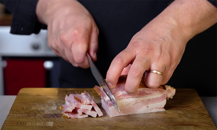 Bulves kruopščiai nuplaukite ir virkite su lupenomis, kol suminkštės. Truputį atvėsinkite, nulupkite ir supjaustykite dideliais griežinėliais. Jei naudojate mažas bulves, tiesiog perpjaukite jas per pusę. Šoninę supjaustykite maždaug pusės centimetro storio ir 2–3 cm pločio griežinėliais. Įkaitinkite sausą keptuvę ir kepkite šoninę, kol taps auksinės spalvos ir išgaruos dalis riebalų.