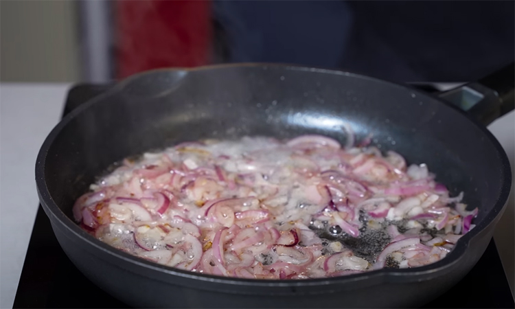 Sudėkite į lėkštę ir likusiuose riebaluose pakepinkite smulkintą svogūną, kol suminkštės ir lengvai karamelizuosis. Sudėkite susmulkintą česnaką ir kepkite dar porą minučių, kad sumažėtų aštrumas. Kai svogūnas taps permatomas ir kvapnus, supilkite sultinį, actą, cukrų ir šiek tiek druskos. Išmaišykite ir sumažinkite skysčio kiekį, kol jis taps tirštas ir klampus.