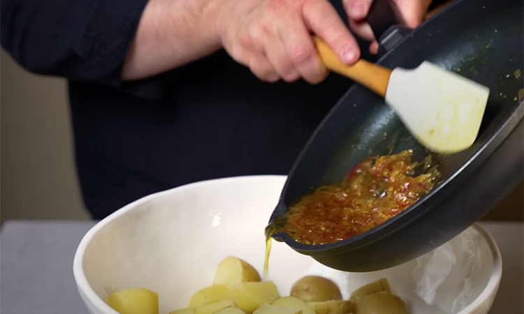 Taip gausite kvapnų, sodraus skonio ir šiek tiek rūgštoką padažą. Dideliame dubenyje sumaišykite šiltas bulves, keptą šoninę, svogūnus su padažu ir smulkiai supjaustytas žoleles. Pagardinkite juodaisiais ir aitriaisiais pipirais ir švelniai išmaišykite, kad bulvės nesuirtų. Paragaukite ir, jei reikia, pakoreguokite prieskonius.
