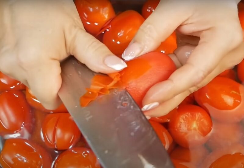 Sterilizuokite skardines ir dangčius verdančiame vandenyje, tada šiltoje orkaitėje arba mikrobangų krosnelėje. Išimkite pedunklą iš pomidorų, mes darome pjūvio kryžių. Supilkite pomidorus su kietu verdančiu vandeniu ir palikite 10-15 minučių.