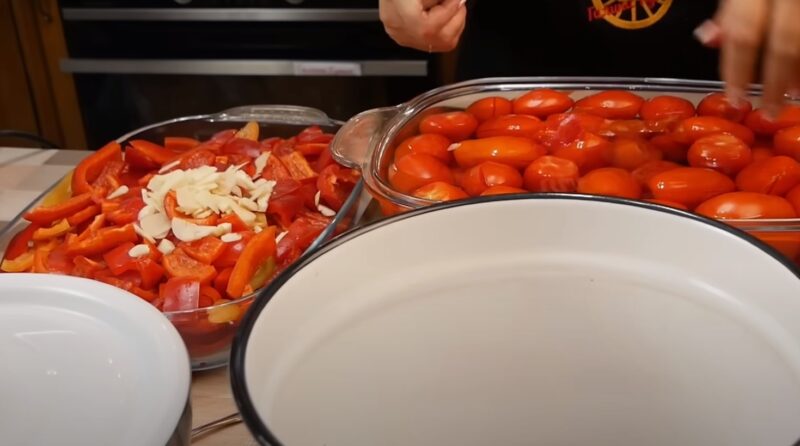 Šiuo metu mes valome česnako plyšius iš lukštų, pašaliname vaisius ir pipiruose. Pipirus supjaustykite dideliais gabalėliais, česnako skiltelės su plonomis lėkštėmis.
