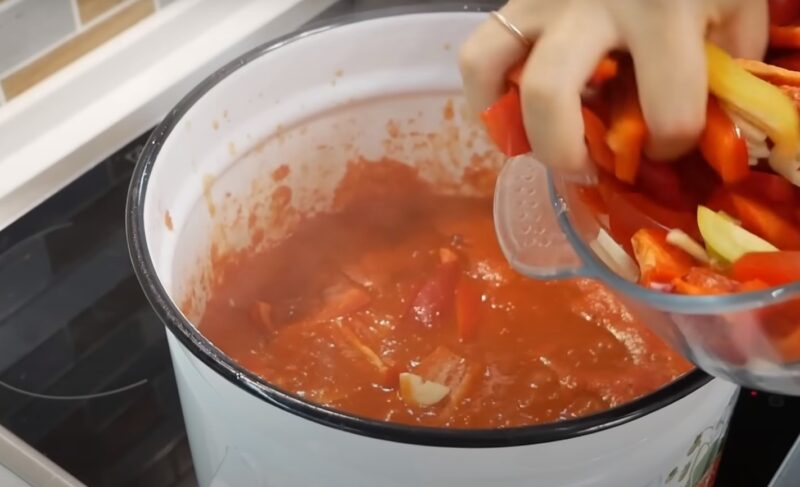 Į pomidorų masę įpilkite česnako ir pipirų.