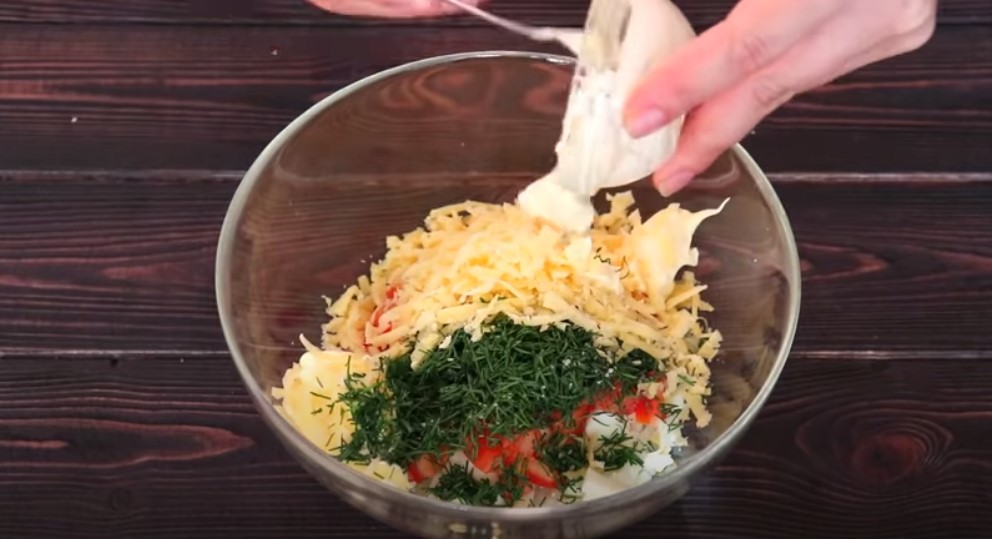 Smulkiai supjaustykite svogūnus ir pomidorus, supjaustykite žalumynus, patrinkite sūrį ant tritacijos ir sumaišykite visa tai su majonezu.