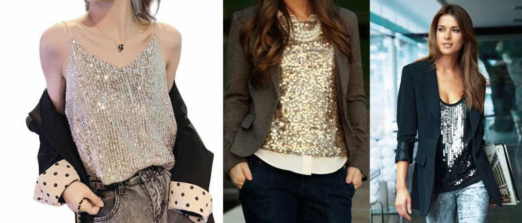 Auksinė blizgučiais puošta palaidinė, derinama su kelnėmis arba sijonu, – puikus pasirinkimas toms, kurios nori suspindėti ir atkreipti dėmesį.