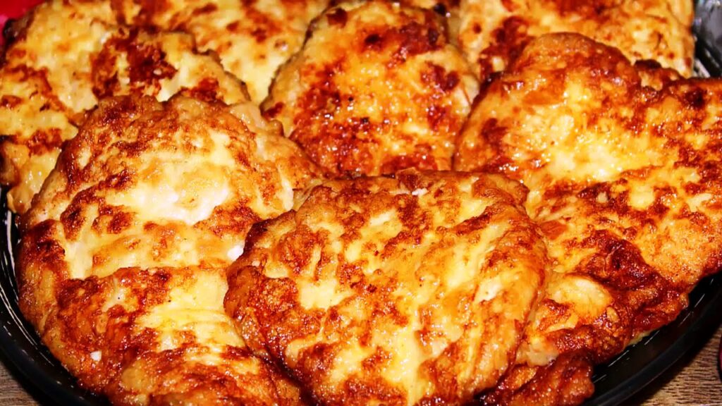 Kiekvienas mėsos gabalas pilamas į miltus, tada lašame į svogūnų fizinę masę ir kepame karštą augininį aliejų iš abiejų pusių.