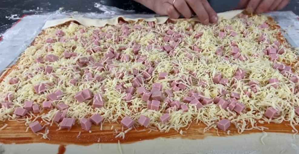 Supilkite tešlą į sluoksnį ir sutepkite kečupu – šis padažas taip pat patinka ar net pakeičiate pomidorų padažu.
