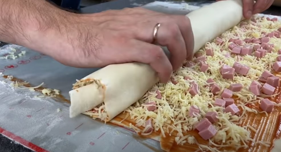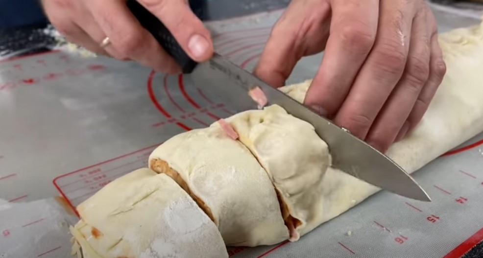 Dabar mes pasukame įtemptą ritinį ir supjaustome aštrų peilį ant gabalų, kurių storis yra apie 5 cm.