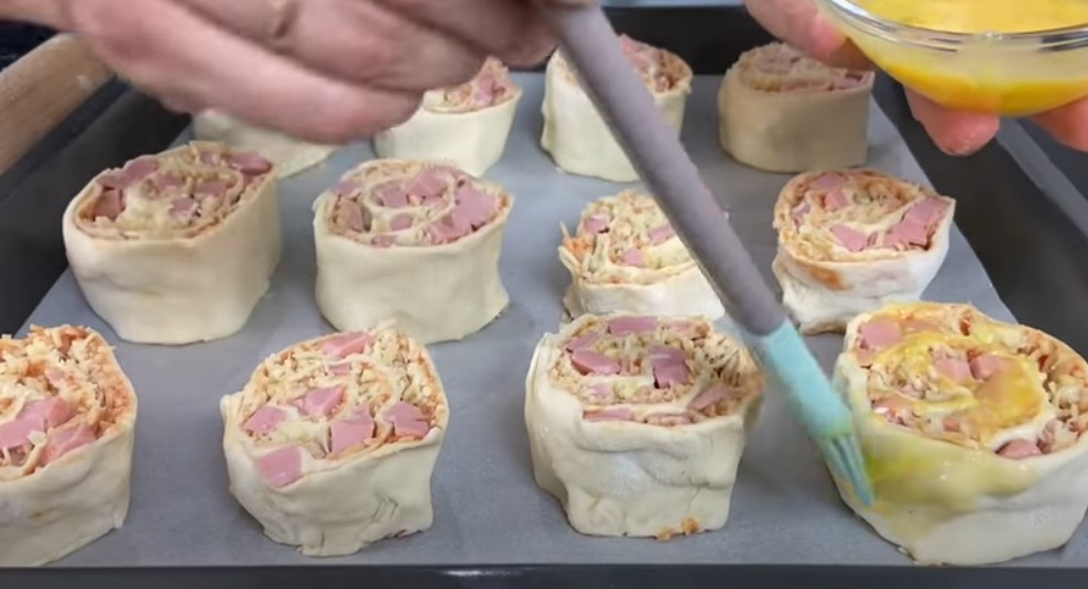 Patarimas: tokiose bandelėse galite įdėti įvairių produktų. Pavyzdžiui, pakeiskite dešrą su kumpiu arba virta mėsa, pridėkite keptų grybų, vis tiek galite džiovinti pomidorus ir kt.