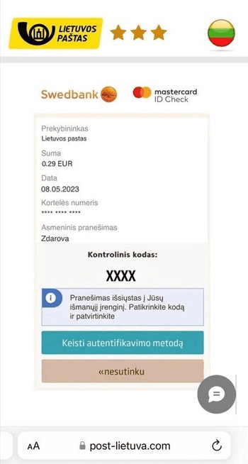„Sukčiai Lietuvos pašto vardu praneša esą siunta negali būti pristatyta, kol nebus sumokėtas siuntimo mokestis. Teigiama, kad jo nesumokėjus per 24 val. siunta bus grąžinta siuntėjui. Pranešimas nuveda į sukčių naudojamą interneto svetainę, kurioje, neva, galima stebėti siuntos kelią ir sumokėti siuntos mokestį.